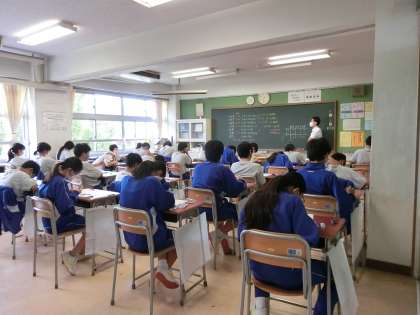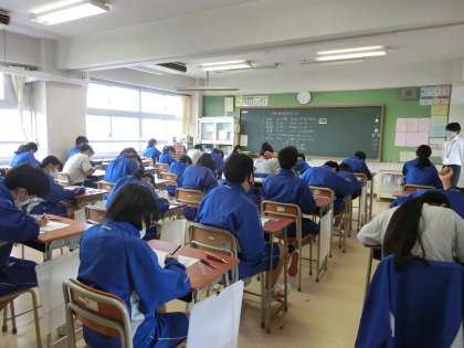 9月23日、24日と2日間、期末考査が設定されています。本日は、社会・数学・国語・音楽・美術が行われました。授業時間を確保するため例年になく給食付での期末考査でした。