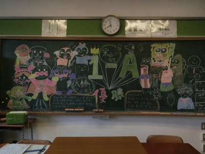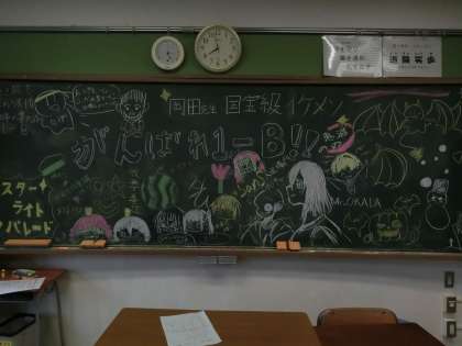 1年生初めての学校行事、意気込みを各クラス黒板に書いてました。