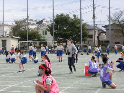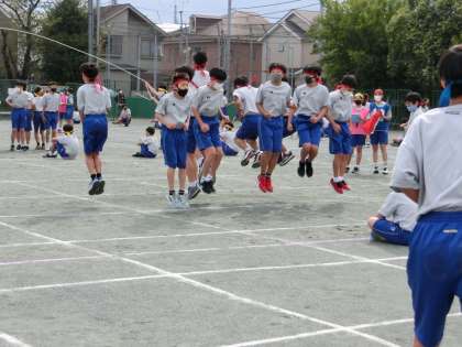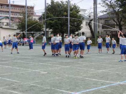 男女各2チームにわかれ、タイミングを合わせて一本の縄を跳びます。回し手の2人は力強く縄を回し、全体をリードします。