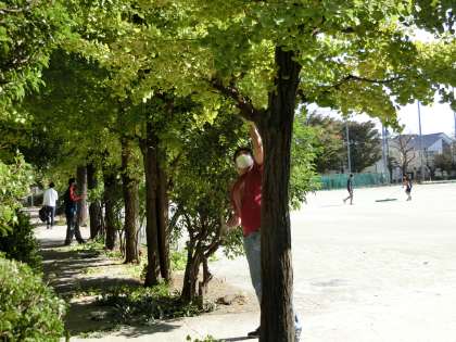 ボランティア生徒とおやじの会の皆様で、13:00から16:00まで花壇づくりを行います。その前に大人だけで整地していただきました。