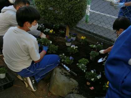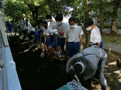 1年生18名、2年生18名、3年生4名(野球部・吹奏楽部・テニス部)がボランティアとして花壇づくりに参加してくれました。