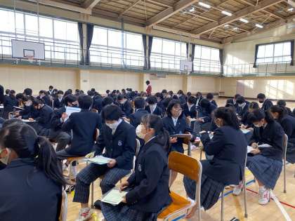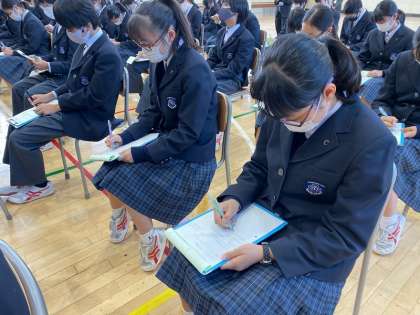 10月30日(金)キャリアコンサルタント大橋龍司先生をお迎えし、「働くということ」をテーマにご講演いただきました。先週の「高校授業体験」に続き、キャリア学習の実践的な学びとなりました。いくつかのエクササイズを交えながら、楽しく分かりやすい内容で、メモを沢山とり、真剣にお話を聴く姿が印象的でした。最後は時間がたりなくなるくらいに質問も飛び交い、有意義な授業となりました。