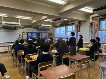 2年生の英語の授業では、1年間学んできた事を生かして、自分の好きなこと・ものについてのプレゼンテーションを行います。本日は、教科書の本文やWho is this?のクイズを通して、文の内容や構成を学びました。クイズでは先生達に関する内容を取り入れ、楽しそうに考える姿がありました。音読や聞き取りを通して理解を深め、まとめでは文の構成について確認をしました。今回学んだことをプレゼンテーション作りに繋げていって欲しいです。どんな作品が出来上がるか、今から楽しみです。