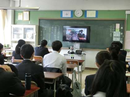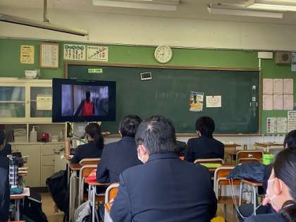 生徒会長の話、生活委員会・美化委員会の反省・目標の後、生徒会役員が製作した「学校生活のルールやマナーのビデオ」が問題形式で上映されました。