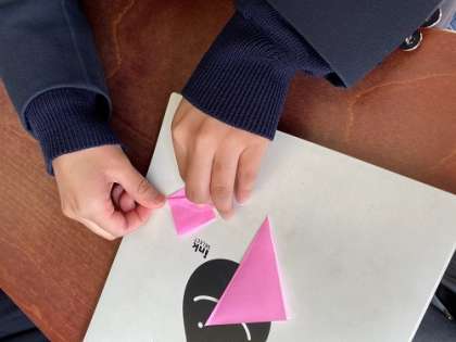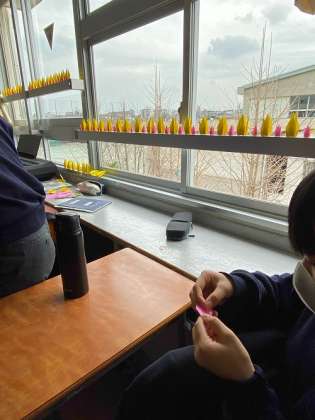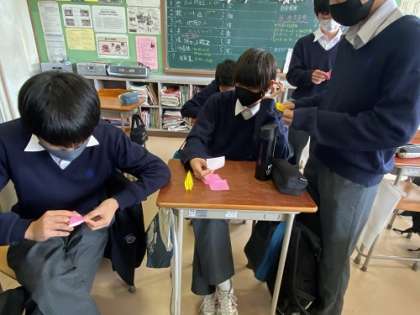 昼休みなどを利用して、生徒会恒例の「卒業お祝いメッセージ」の「折鶴」の製作をしています。心を込めて、3年生の門出をお祝いしよう。