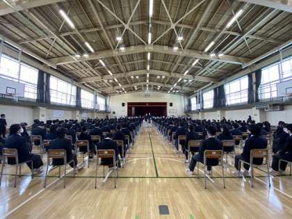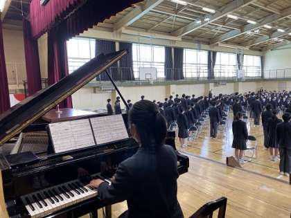 3年生はここ一週間、19日の本番に向けて練習を重ねてきました。本番はZOOMでテレビ越しに参加となる1・2年生ですが、今日の練習は参列し、先輩の門出をお祝いしました。本番さながら、厳かに予行練習に臨む姿は立派でした。