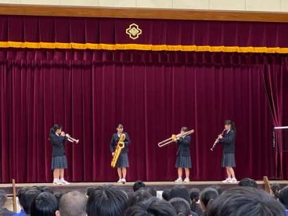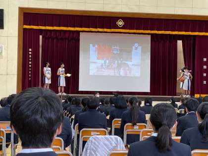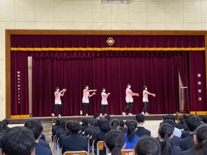 委員会活動の説明、部活動紹介が行われました。どの部活も思考を凝らして、制限時間内、制限人数を守り効果的に発表していました。