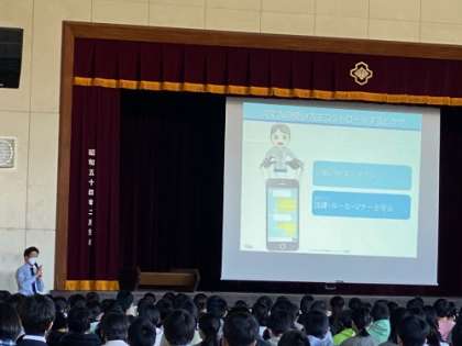 東京都都民安全推進本部「ファミリeルール」より講師の先生をお迎えしました。SNSなどの被害にあわないためのルールやマナー、また、逆の立場にならないために「行動の結果を考える」こと、「法律・ルール・マナーを守って使うこと」「家庭でのルールを作っておくこと」など、身近に起こりうる映像なども使いながらご講演いただきました。