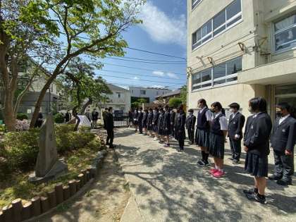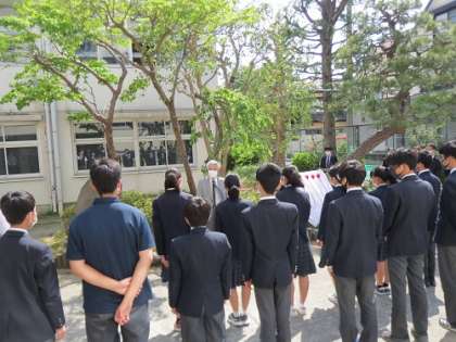 天候にも恵まれ、同窓会代表の方々、PTA会長、生徒会役員、各クラス代表学級委員、ファンファーレ担当吹奏楽部が見守る中、除幕式が行われました(除幕式2に続く)