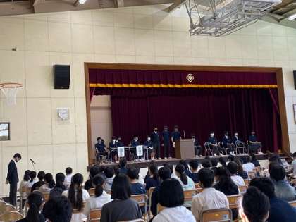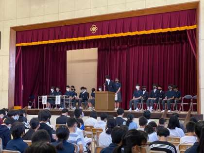 最後に、創立70周年モニュメント除幕式の様子が上映され、令和3年度の生徒会活動のスタートを切りました。
