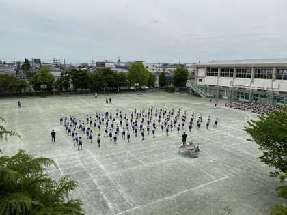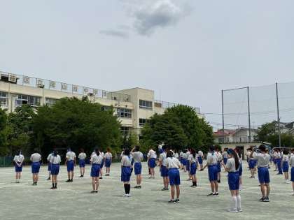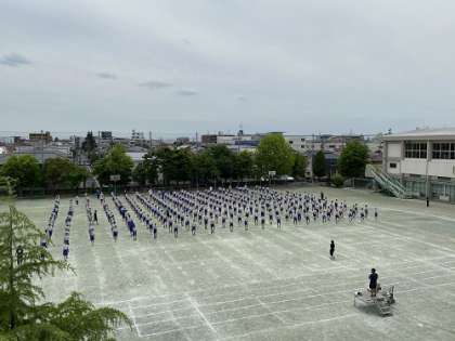 体育祭に向けて、練習が始まっています。本日は、3学年合同の全体練習が行われました。練習前後の、手の消毒、手洗いはもちろん、恒例の体育委員の声出しで(写真左)、心を一つにして全体練習が始まりました。
