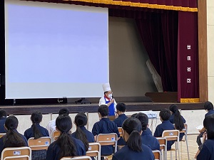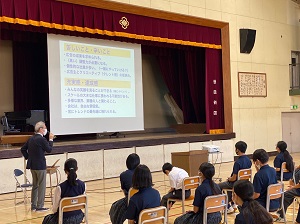 1年生の総合的な学習の時間(キャリア学習)で「地域の方のお話を聴く会」が行われました。レストランロアジシェフ 佐藤幸雄さん、元電通にお勤めで、現本校スクールサポートスタッフの宮島泉さんをゲストティーチャーとしてお招きしました。地域や身近な方々との交流を通じ、様々な職業の理解を深めながら、働く意義について学び、これからの生き方を考えました。