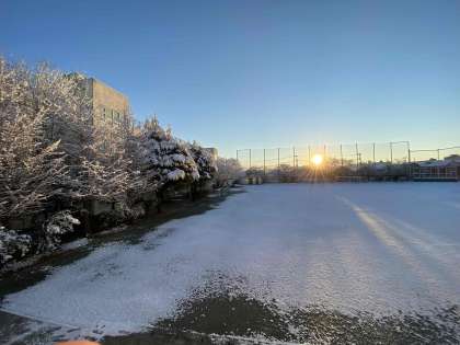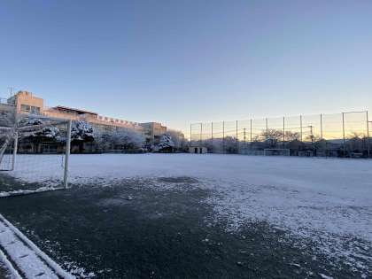 昨日の雪で、尾山台中学校も一面の雪景色となりました。朝日に輝く学校の様子をご覧ください。
