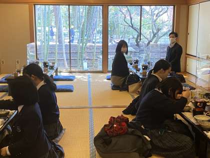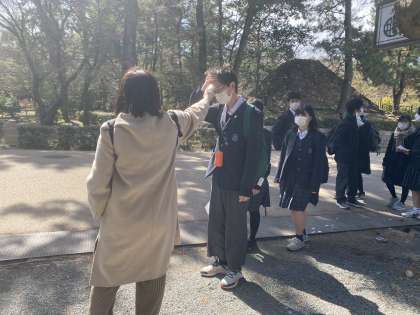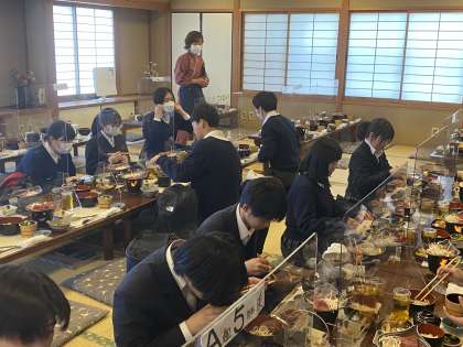 班行動の途中、食事場所に立ち寄ります。人員チェック→検温→手洗い→手指消毒→いただきます。