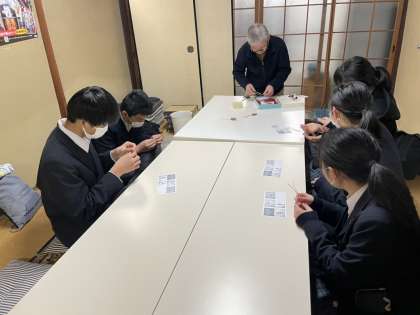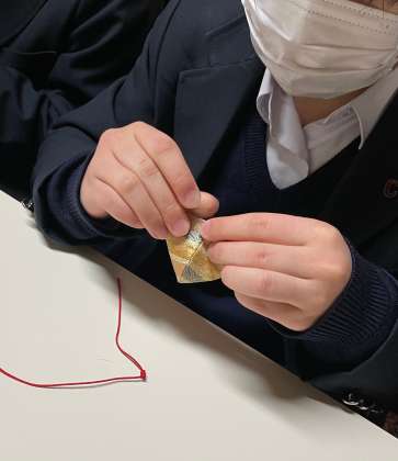 まず組紐を編んで、西陣織でできた小袋の口をセンス良く閉めていきます。口を小さくするのがポイントですが、苦戦中です!