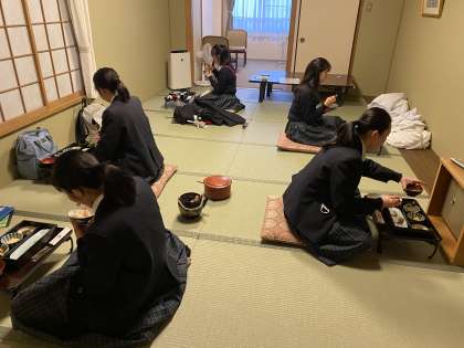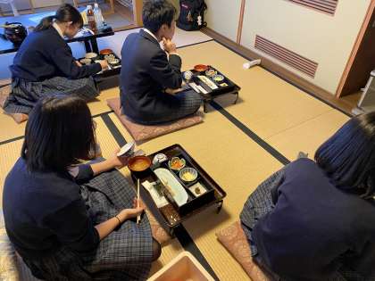 部屋食で、お膳でいただいています。前後の手指消毒、黙食を守ります。今日はタクシー行動、運転手さんのガイドで楽しい思い出を作りましょう。