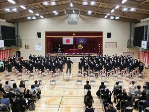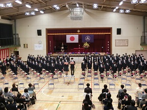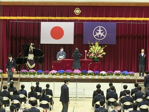 第71回卒業式が行われました。1・2年生は教室からオンラインでの参列でした。校長先生の祝辞は、東京大学池谷教授の講演より「好きが最強の動機付け」である。「好奇心」を大切に生きることのなど、卒業生に向けて、励ましのメッセージが送られました。在校生からの「送る言葉」、卒業生からは3年間の思い出のつまった「卒業の言葉」。「大地讃頌」「旅立ちの日に」「送別の歌」「校歌」を合唱しました。保護者の方々の参列の中、感動的な卒業式となりました。令和3年度卒業生「輝け未来の希望」