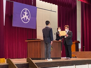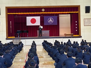 その後の全校集会では、学校運営委員長より2学年に向けて「感謝状」が贈呈されました。感謝状は、職場体験が中止となった中、くじけることなく、道の駅や地域と交流し、中学生の視点から社会の課題解決に取り組み、キャリアについて真剣に考え取り組んだ努力に対して高く評価されたものです。生徒会長の言葉、生活指導主任のお話で修了式を終えました。