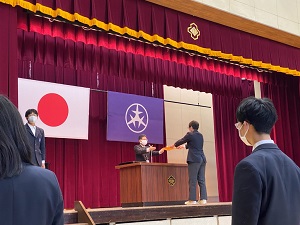 令和3年度修了式が行われました。校長先生より、各学年代表生徒に修了証が渡されました。1年間を振り返り、1・2年生の成長を称え、「自律」「努力」について励ましのメッセージが送られました。