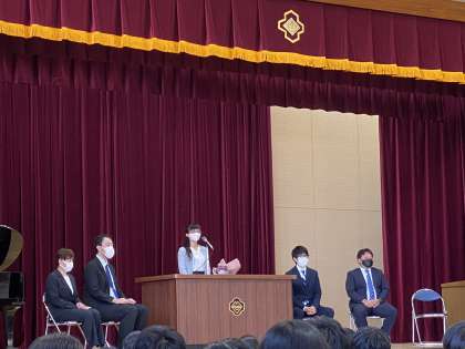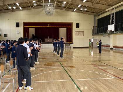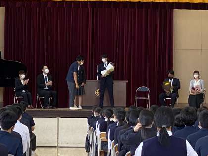 昨年度まで尾山台中学校を支えた教職員の方々の離任式が行われました。代表生徒によるメッセージと花束が贈られました。去られた先生方からは、温かな励ましの言葉が贈られました。最後に校歌を合唱しました。感動的な離任式となりました。