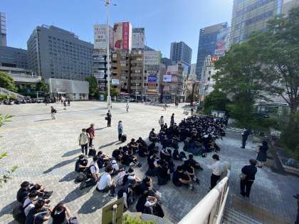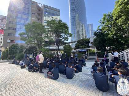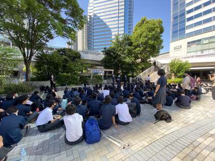 第一関門、班で品川駅、ふれあい広場に到着しました。出発式が行われました。