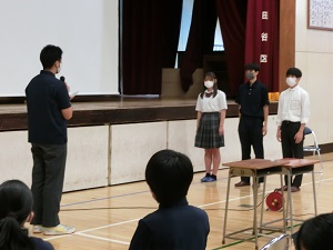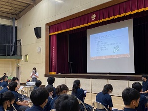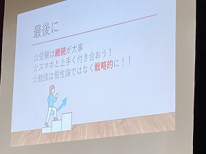 7月9日(土)3学年では、総合的な学習の時間で「高校生の話を聴く会」が行われました。これから、受験生といわれる夏を過ごす3年生に向け、昨年度、同じ経験を乗り越えた先輩方3名がお話をしてくださいました。先輩方は、それぞれにパワーポイントを作成し、「高校選びについて」「受験までの学習方法について」「高校生活について」など、わかりやすくお話をしてくださいました。