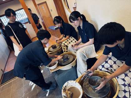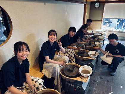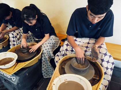 嘉祥窯(かしょうがま)「京焼ろくろ体験」では、電動ろくろを使った陶芸・湯呑みづくりが体験できます。清水寺近くにあり、窓越しに三年坂を眺めながら、スタッフのサポートの下、望みの形に仕上げていきます。