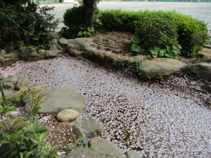 春のビオトープは、桜の花びらが池に落ち、一面に敷き詰められたようになっています。休み時間には、子どもたちが池周辺の整備を行い、熱心に観察をしています。 |