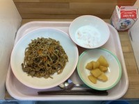 <献立>ソース焼きそば牛乳じゃがいもの甘辛煮フルーツヨーグルト