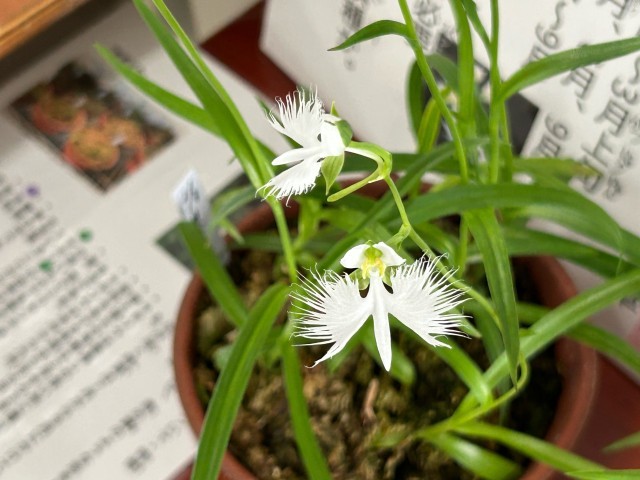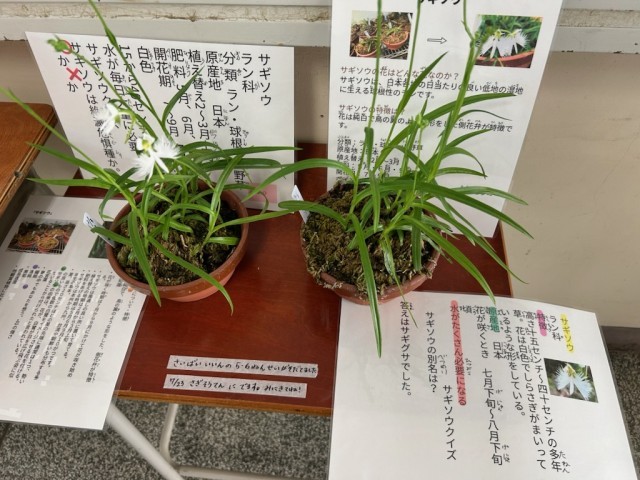 栽培委員会のみなさんや地域のみさなんが大切に育ててくれているサギソウ。今年もとうとう美しい花を咲かせてくれました。主事室前に展示してありますので、ご来校の際はご覧ください。関係者のみなさま本当にありがとうございます。