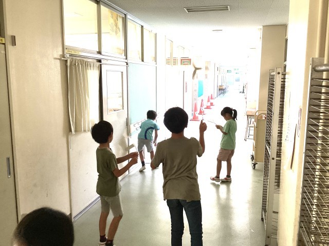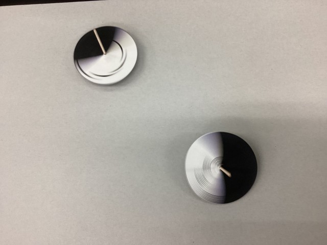 理科室では、校長先生による「ブーメラン」と「ベンハムのこま」のおもちゃ作りが行われました。くるりと返ってくるブーメランを廊下で楽しそうに飛ばしたり、黒と白の模様でできているはずなのに、回すと色が見えるこまを何度も回したりして楽しんでいました。