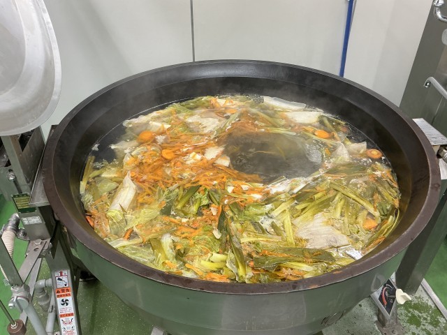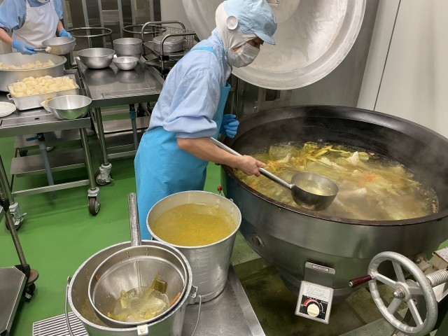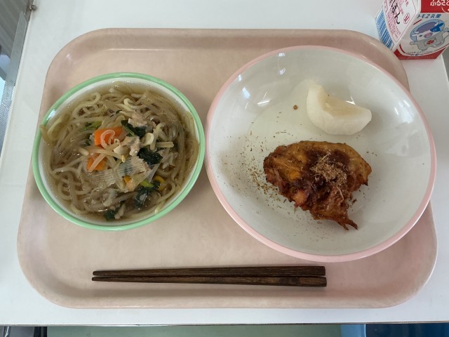 今日はキッズタイムということで、すぐ食べられる献立にしました。人気のラーメンのスープは、鶏がらと野菜くずをコトコト煮て、手作りしています。ほとんどのクラスで、あっという間に空っぽになっていました。おかわりの行列もできていました。たこぺったんは、大田区の学校給食発祥のメニューです。お好み焼きのような生地を油でカリッと揚げて、ソースをかけて、かつお節をふりかけました。