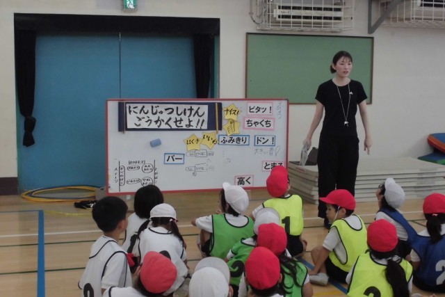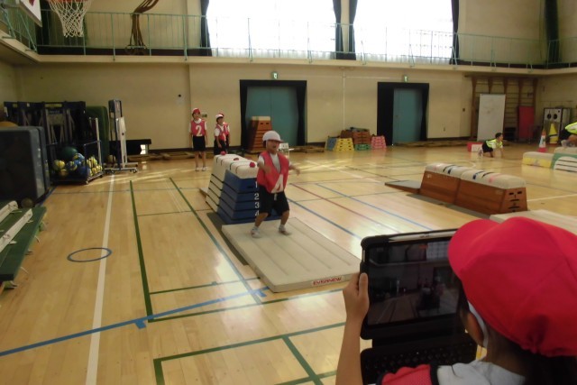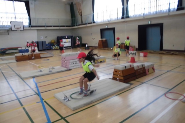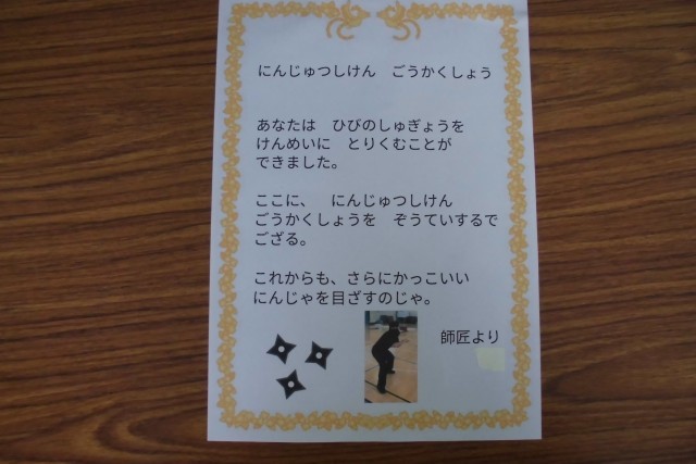 今日は2年生の「跳び箱を使った運動遊び~かっこいい忍者になろう~」の最後の時間でした。忍術試験では、自分が意識したいポイント「ピタッと(着地をピタッと止める)忍者になります!」などと宣言して跳びます。友達がしっかり着地できたり、高く跳べたりするとみんなから「いいね!」「ナイスピタッと!」などの声がたくさん聞こえました。みんな頑張って修行ができたので、忍者の師匠から「にんじゅつしけんごうかくしょう」をいただきました。主体的に取り組み、跳び箱運動につながる動きを子どもたちはたくさん経験できました。