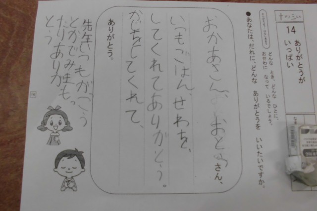 小学校に入学して半年が経った1年生。どんどんできることが増えています。道徳「ありがとうがいっぱい」では、日々お世話になっている人を思い浮かべ、ありがとうの気持ちを伝える手紙を書いていました。覚えた漢字もたくさんになり、カタカナは全部覚えて言葉としての活用をしています。とっても集中して取り組んでいました。子どもたちの成長って素晴らしいですね。