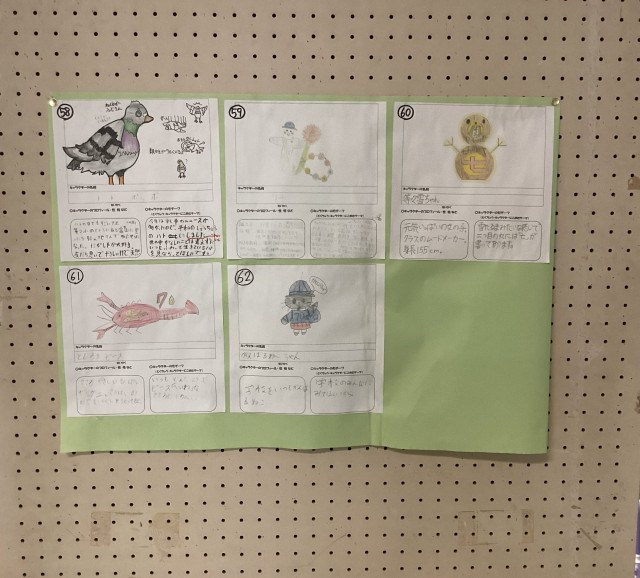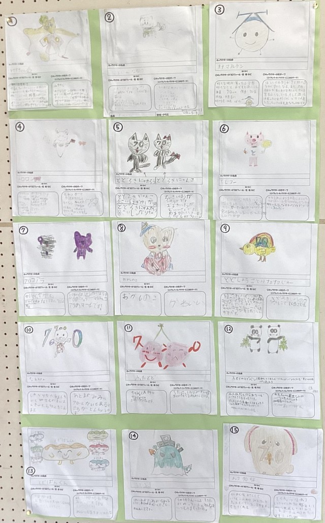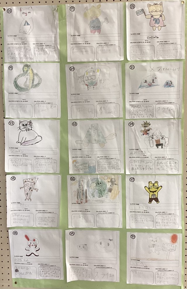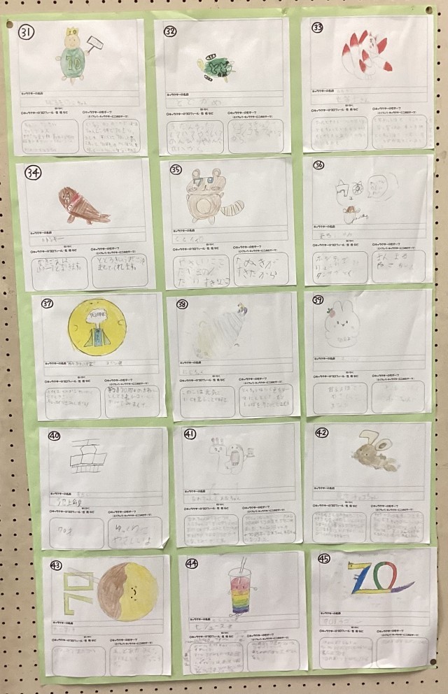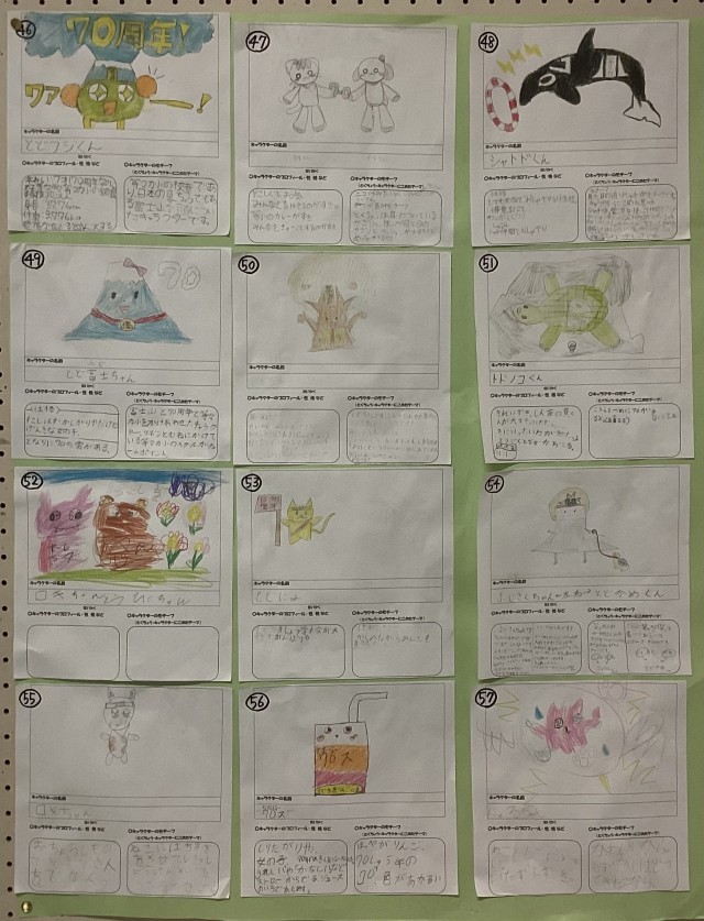 来年度等々力小学校は70周年を迎えます。来年度に行われる70周年記念式典に向けて、計画委員さんからキャラクター選出のお知らせがお昼の校内テレビ放送でありました。「キャラクターデザイン募集の紙が中央玄関の掲示板に貼り出されているので、1人一つ、お気に入りのキャラクターにシールを貼ってください。」という内容でした。