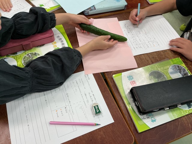 せたがやそだちの野菜を使う理由を考える場面では、「新鮮」「おいしい」「環境にやさしい」と発表しました。実際にせたがやそだちの野菜と、他の地域産の野菜を比較し「きゅうりは、棘が多いと新鮮なんだね、じゃあ、せたがやそだちかな。」と考えていました。立派な野菜を育てるために、農家の人はどんなことをしているのだろうと、次回の学習へと学びを繋げていました。