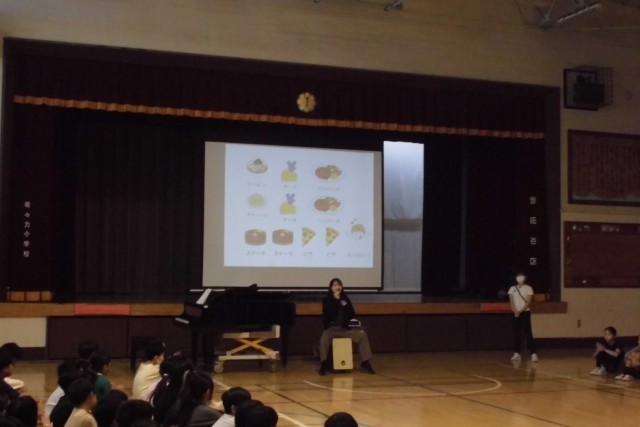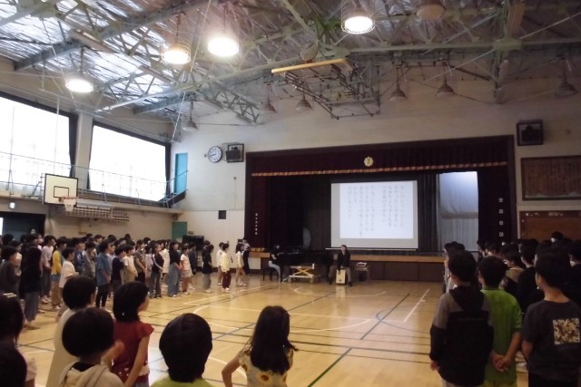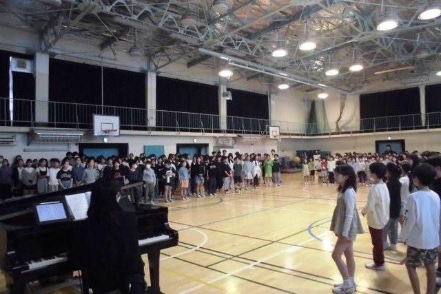 今日は、1・3・5年生は体育朝会、2・4・6年生は体育館で音楽朝会でした。体育朝会では、クラス長縄跳びの記録に挑戦しました。自分たちのベストの記録が出るように、みんなで声をかけ合っていました。もう1回体育朝会があるので、それぞれのクラスで練習をしていきます。音楽朝会は「風になりたい」の合唱です。きれいな歌声で歌うだけではなく、途中の間奏部分では手拍子でリズムを刻みます。なかなか難しいので、「ステーキ、ステーキ、ピザ、ピザ、食べたい!」と語呂合わせをすると、みんな上手に楽しくたたくことができました。とても充実した朝の活動になりました。