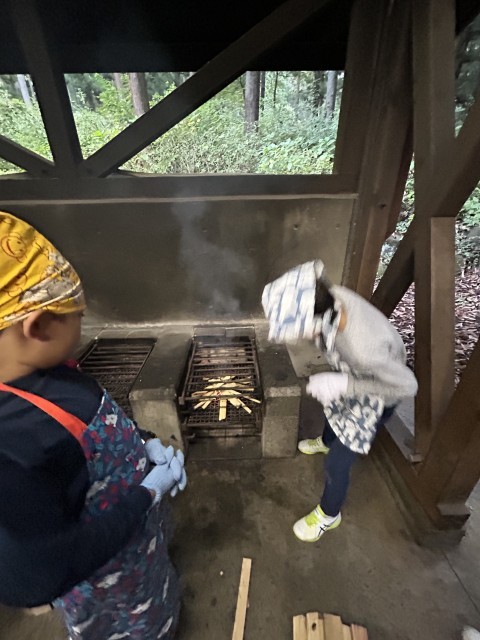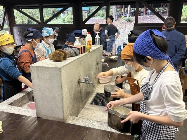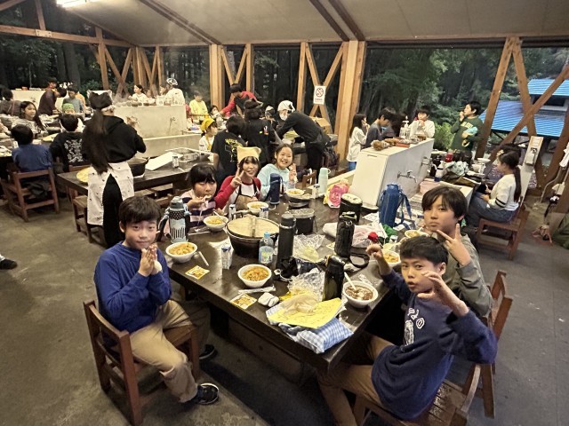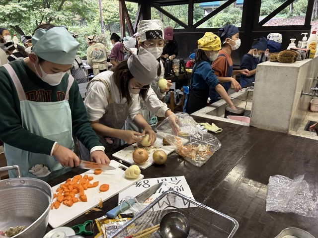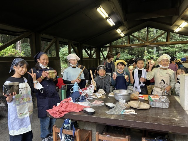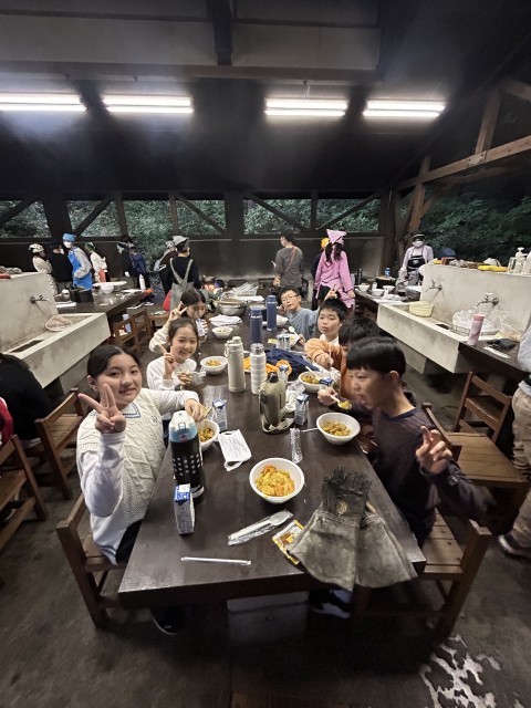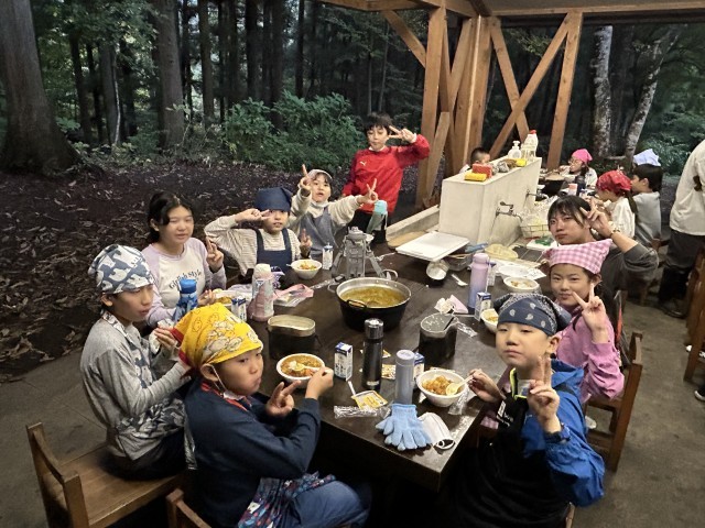 飯盒炊飯です。みんなで協力しながら美味しいカレーが出来上がりました。火起こしも、カレー作りもあまり体験したことがない子たちも頑張りました。カレーの味の感想は帰ってから聞いてあげてください。