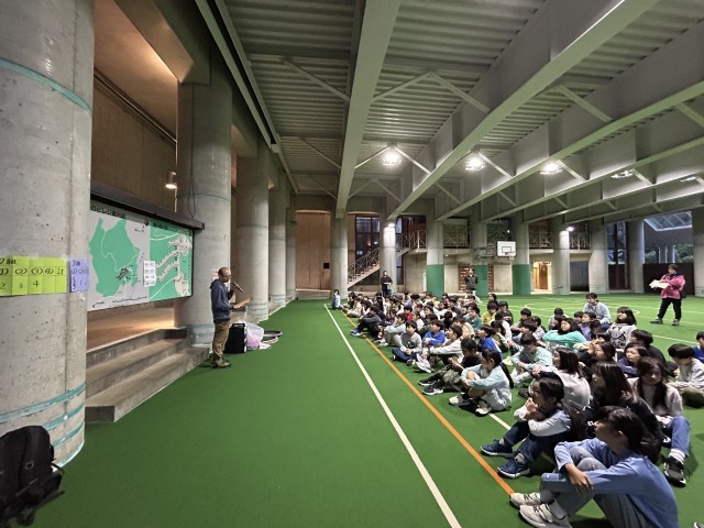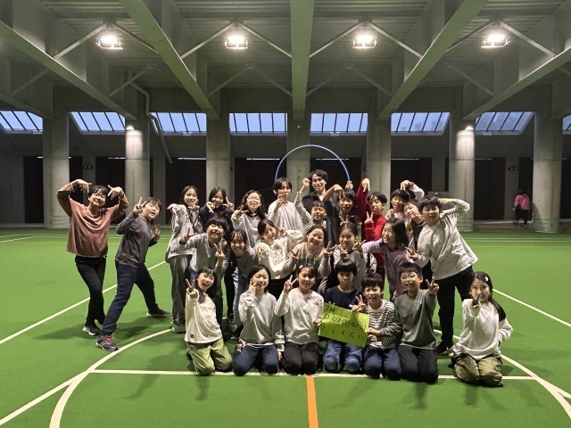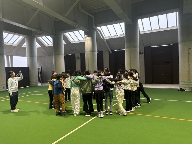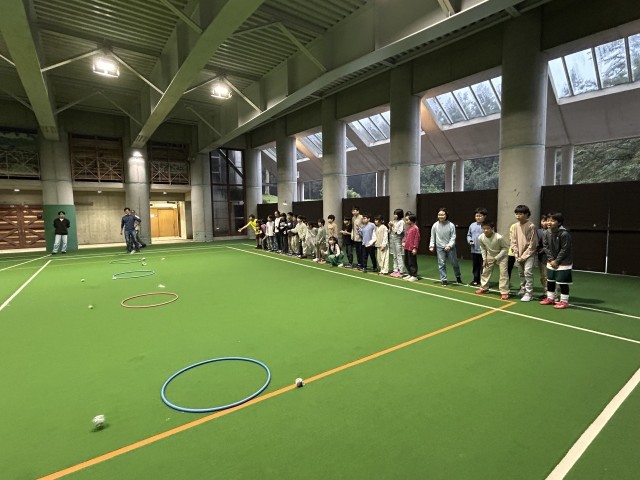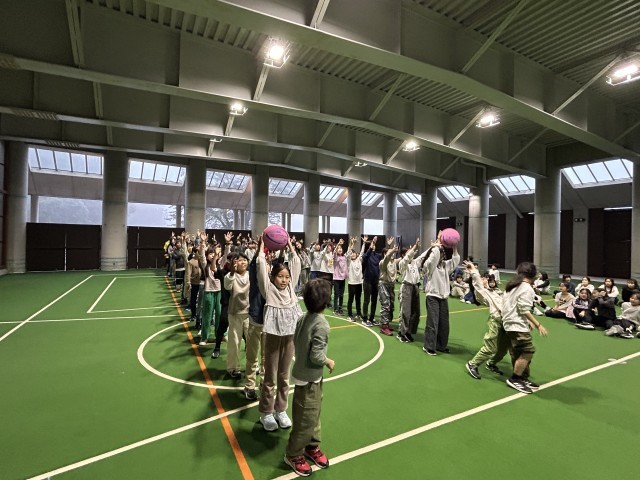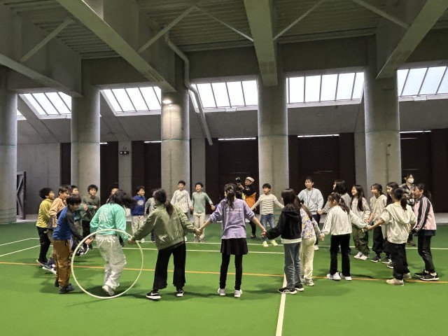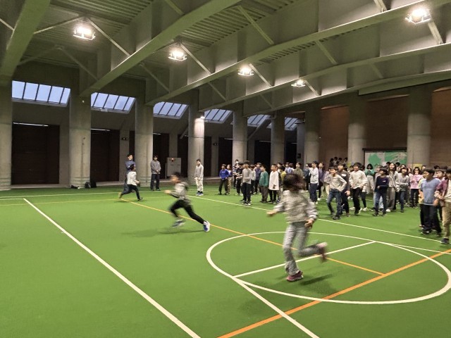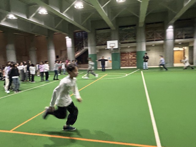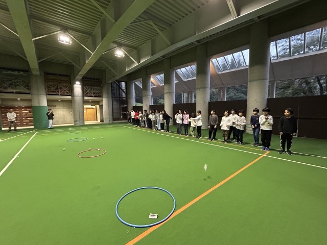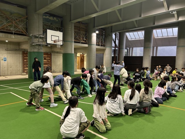 先生企画の室内レク大会です。クラス対抗で、フラフープ輪くぐり、ボール運び、新聞紙リレー、新聞紙カーリングを行いました。クラスで団結して盛り上がりました。そして、室内レク大会の優勝は2組さんでした。おめでとうございます!