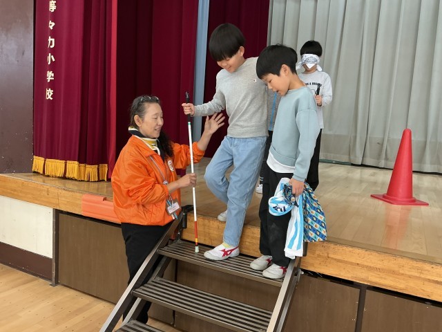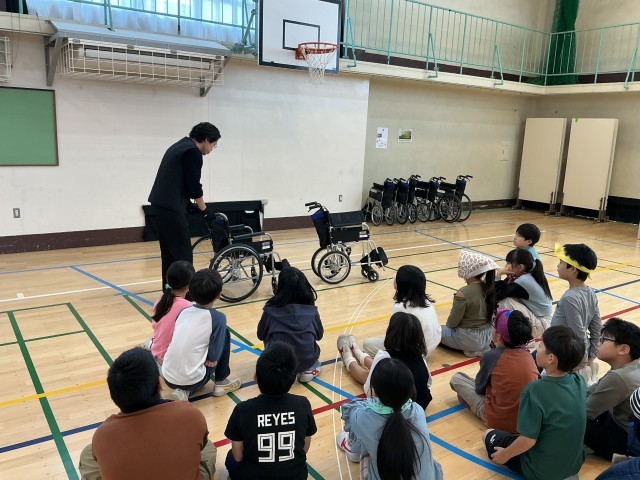 4年生の総合的な学習の時間で学んでいる「福祉」について、本日は白杖や車椅子の体験をさせていただきました。白状の役割や車椅子の扱い方についてお話しいただき、実際に段差や狭い道を歩いたり、進んだりする体験を行いました。体験を通して、「怖かった」「大変だった」などの感想を友だちと交流していました。また、「点字ブロックの上に何かものがあったら動かしてあげたい」や「声をかけて助けたい」と身近で自分たちにできることを考える姿が見られ、自分の生活にも福祉が関わっていることを実感しました。