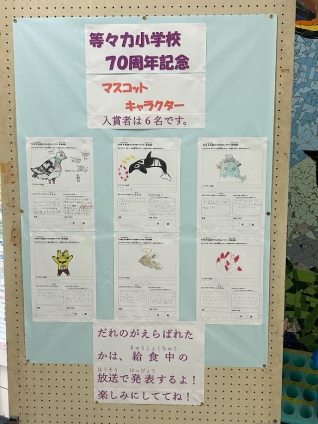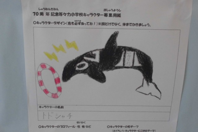 令和8年度の等々力小学校開校70周年へ向けて準備が進んでいます。その一つが70周年記念キャラクターです。学校公開の際にご覧になった方が多いと思いますが、全校に募集をかけ、子どもたちが投票しました。子どもたちの票がとても多かった6つのキャラクターが入賞です。そこから、キャラクターの設定内容、デザイン等の検討を重ねた結果、来年度の等々力小学校開校70周年の公式キャラクターは『トドシャチ』に決定しました。おめでとうございます。選ばれなかった子どもたちの応募作品も、等々力小学校の周年を盛り上げよう、良い学校にしよう、学校の特徴などが現れた素晴らしいものばかりでした。ありがとうございました。