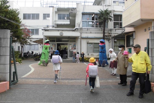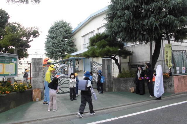 今日はハロウィン当日。PTA役員のあいさつ担当の方の発案で、「ハロウィンの仮装をして子どもたちを迎えたら笑顔にしよう」と集まっていただきました。三和会のみなさん、おやじの会のみなさん、PTA役員のみなさん、保護者のみんさん本当にありがとうございました。子どもたちみんな大喜びであいさつすることができました。子どもたちの笑顔を見ると幸せになりますね。