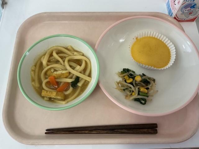 今日から一週間は、とどろきフェスタとコラボメニューが登場します。これは給食委員会の5年生が企画してくれました。1日目の今日は、1年生のお面の作品とコラボして「麺料理」のカレーうどん、2年生の虫の作品とコラボして「蒸し料理」の米粉のかぼちゃ蒸しパンを作りました。木曜日からのフェスタ、楽しみですね。