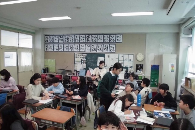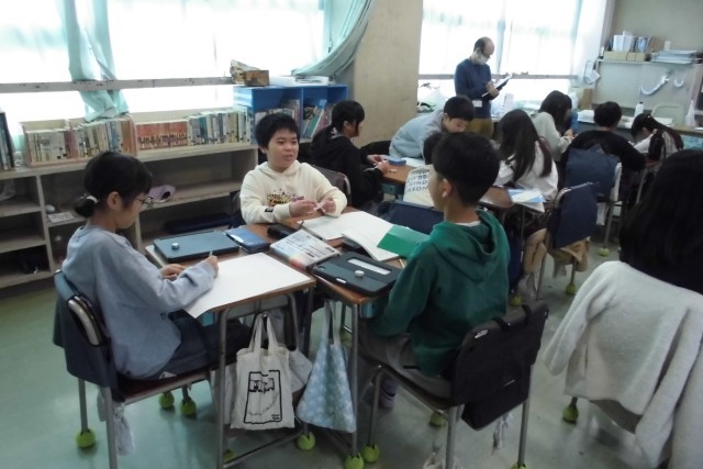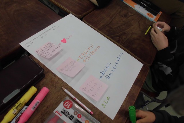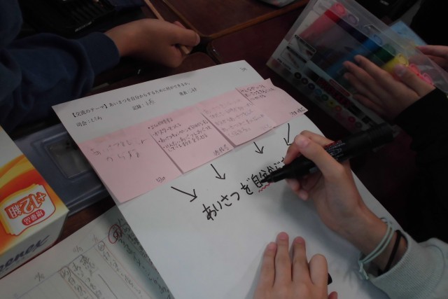 よりよい学校生活のためにできることを考えいてる5年生。今日の議題は「あいさつを自分からするために何ができるか。」です。自分の考えを付箋に書いて共有し、グループごとに話し合いました。司会、記録と役割を分担し、上手に話し合いを行うことができました。話し合われたことをもとに、今後、実践していく予定です。この話し合いをもとにすてきなあいさつの輪が広がるとよいですね。