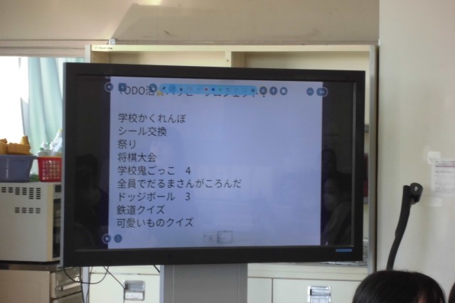 2つ目は、「とど活ハッピープロジェクト」について。先日第一弾の「鉄道クイズ大会」が行われましたが、全学年の子どもたちに、やって欲しいことを募集した結果がでました。学校かくれんぼ、だるまさんが転んだ、クイズ大会など様々ですが、安全面も含め実現の可能性が高いものを選び、これから運営してくれる人を6年生から募ります。とど活ハッピープロジェクトの第二弾も盛り上がるとよいですね。委員長会議のみなさんありがとうございました。