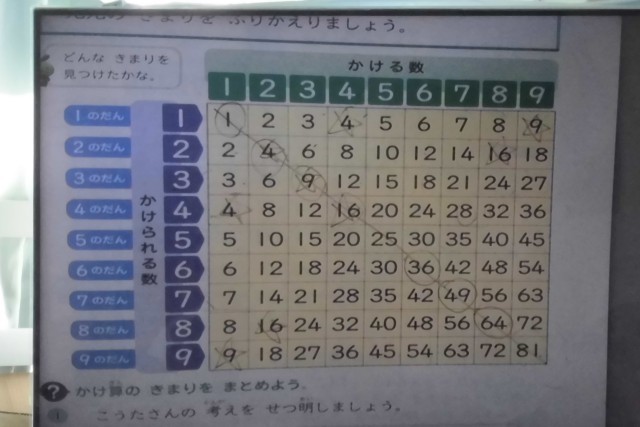 アーノルド=ローベル作の「お手紙」を題材に話し合っている2年生。今日は物語の終盤の、登場する生き物の気持ちについて読み深めました。昔から教科書に載るとてもすてきなお話ですので、ぜひ皆さんもお読みいただき子どもたちと話し合ってみてください。算数は、かけ算九九の学習がまとめの段階です。今日は九九表やこれまでに学習したことから、「かけ算のきまり」について考えました。「1、25、49、84、81など、一つしかないものは、かける数とかけられる数が同じ」などの発見をした子がいると、周りの子たちも「おーなるほど!」などのつぶやきがあり、みんなで考えながら楽しく学習できています。ご家庭でもきまりをたくさん見付けてみてください。