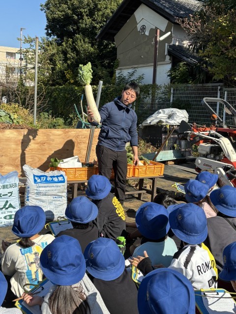 3年生は先週の金曜日に大根ほりに出かけました。畑では、大根の育て方など説明を受け、大きな大根を収穫させていただきました。今日は、大平農園さんに見学に行きました。事前にどんな仕事をしているのか、育てる工夫はどんなことがあるかなど質問や予想をしてからインタビューをしました。世田谷育ちの野菜はとても貴重なこと、朝市で販売していることなどを教えていただきました。「農家さんの仕事はいつも天気を気にしていなければいけないんだね。」「手作業で行うことと、機械を使って作業することもあるんだね。」と農家さんの仕事について詳しく知ることができました。大平農園さん、ありがとうございました。