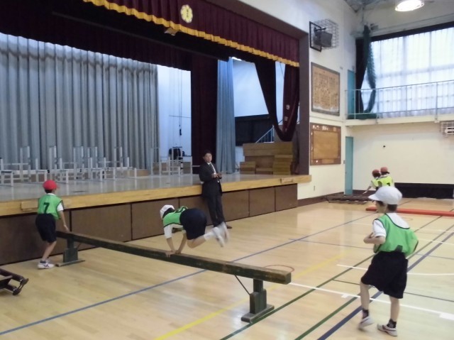 1年生は「跳び箱を使った運動遊び」です。担任の先生が忍者の格好で登場。子どもたちも元気よく忍者の修行を楽しみました。白旗先生からは、3年生も1年生も、より良い動きになるための子どもたちの気付きが優秀。準備も片付けも一流レベルだね。と子どもたちの動きを褒めていただきました。ご指導いただいたことを全校共有し、今後の授業実践につなげていきます。ご指導いただきました、日本体育大学 白旗 和也先生ありがとうございました。そして、1年生、3年生のみなさんもありがとうございました。
