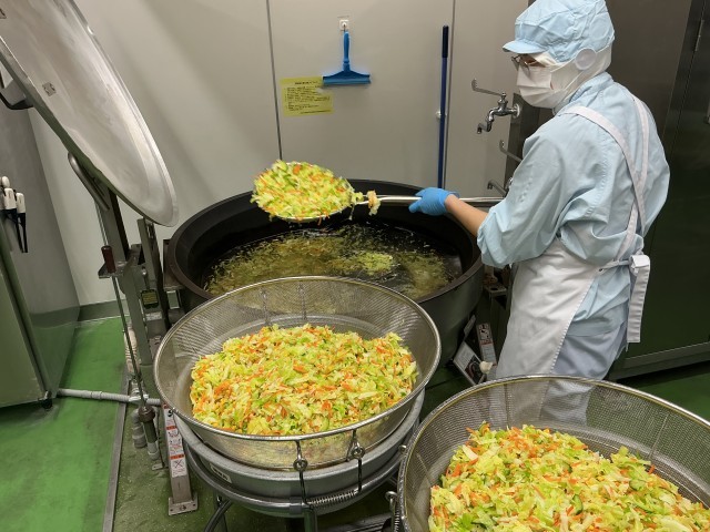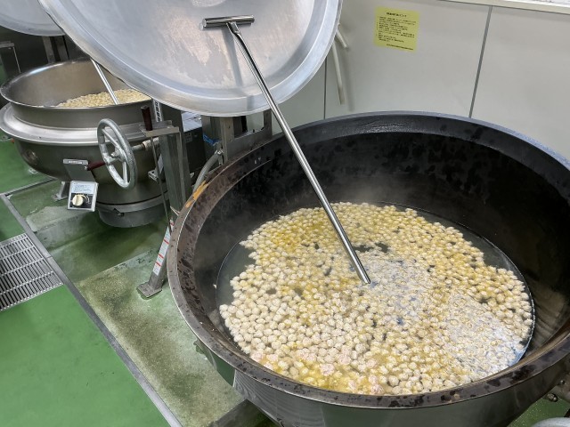 大人気の揚げパンは、ココアと粉砂糖を合わせて味付けしました。スープのネギとサラダのキャベツは、「せたがやそだち」を使いました。榎本農園さんで育てられたネギとキャベツを届けてもらいました。サラダは、いつもの量よりも少し多めでしたが、新鮮な野菜とハムも入って美味しく出来上がったので、たくさん食べていました。スープの豆腐団子は、調理員さん4人がかりで、2000個近くの団子を摘み入れて作りました。