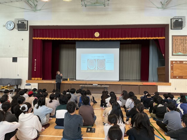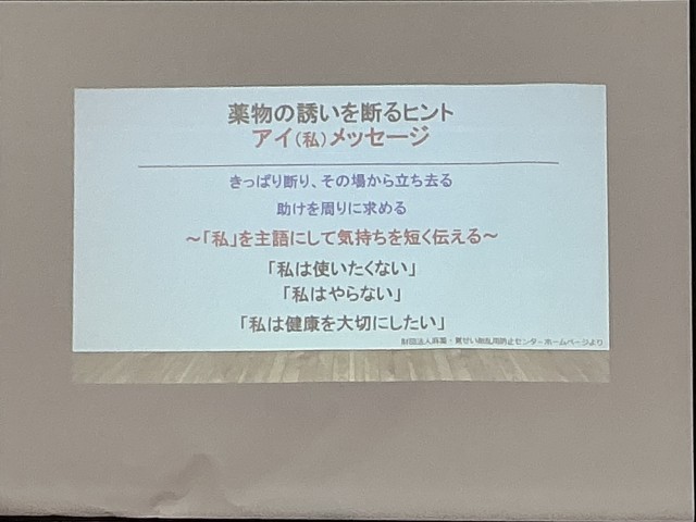薬物乱用防止教室では、学校薬剤師の小林さんに、「正しい知識で自分を守る」というテーマで話をしていただきました。初めは、医薬品の用法・用量を守って飲む大切さ、お酒やタバコの体への影響についてです。怪我をしたり、風邪を引いて薬を飲んだりしたときのことを思い出したようで、質疑・応答の時間には様々な質問が出ていました。薬物については、脳への影響、依存するとどうなってしまうのかなど、薬物がどれだけ危険かを学びました。薬物の誘いを断るヒントとして、「私はやらない」「私は健康を大切にしたい」など、「私」を主語にして気持ちを短く伝える「アイ(私)メッセージ」を教えていただきました。正しい知識をもち、自分の未来を自分で守る力を身に付けてほしいと思います。